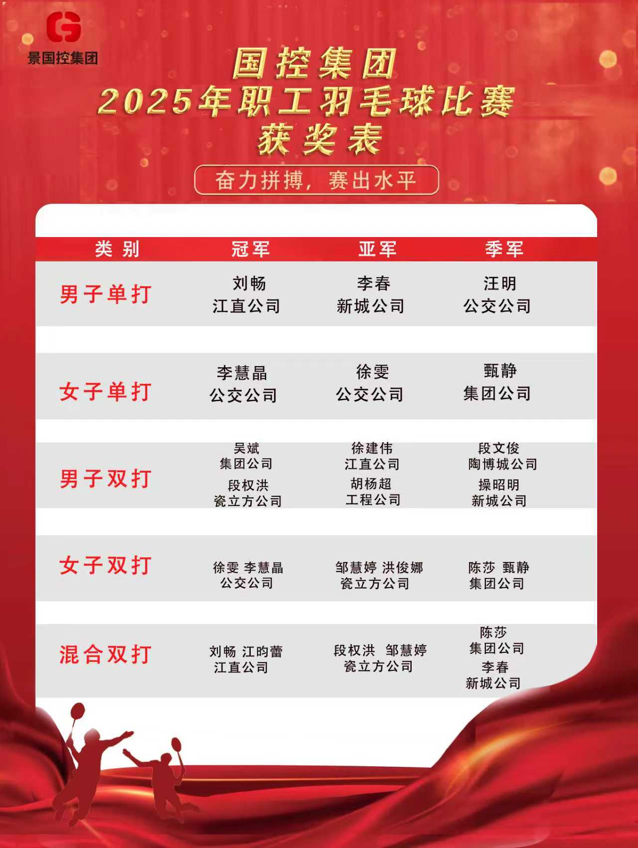 五大單項各決出冠、亞、季軍并現(xiàn)場頒發(fā)榮譽證書,此次賽事不僅是體育競技,更是跨部門協(xié)作的“溝通橋梁”、企業(yè)文化建設的重要載體。未來,集團工會將繼續(xù)圍繞職工需求,豐富文體活動形式,讓“羽動國控,活力飛揚”的精神融入工作各環(huán)節(jié),為集團高質(zhì)量發(fā)展夯實精神基礎、匯聚奮進力量。