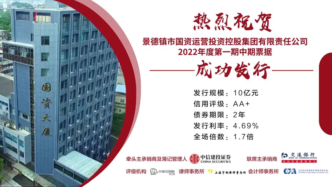 4月6日,景德鎮(zhèn)市國(guó)資運(yùn)營(yíng)投資控股集團(tuán)有限責(zé)任公司2022年度第一期中期票據(jù)成功發(fā)行,發(fā)行規(guī)模10億元,債券期限2年,信用評(píng)級(jí)AA+,發(fā)行利率4.69%,創(chuàng)近一年以來(lái)江西省同評(píng)級(jí)同期限地方國(guó)有企業(yè)債券發(fā)行票面利率新低!近一年以來(lái),景德鎮(zhèn)市中長(zhǎng)期債券發(fā)行首次價(jià)格低于5%!